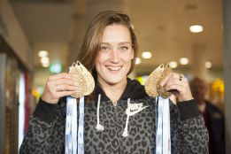 Mireia Belmonte ha aterrizado en Barcelona con las cuatro medallas de oro obtenidas en el Europeo de Herning (Dinamarca). Su llegada levantó expectación, curiosidad y eclipsó al resto de la delegación española. “Estoy muy contenta porque no me lo esperaba. Le doy mucho valor a estas medallas porque tuve grandes rivales”, comentó la nadadora de la UCAM. Mireia tuvo un recibimiento familiar con la curiosidad de que su padre, José, le esperaba con su perro y con una flor.